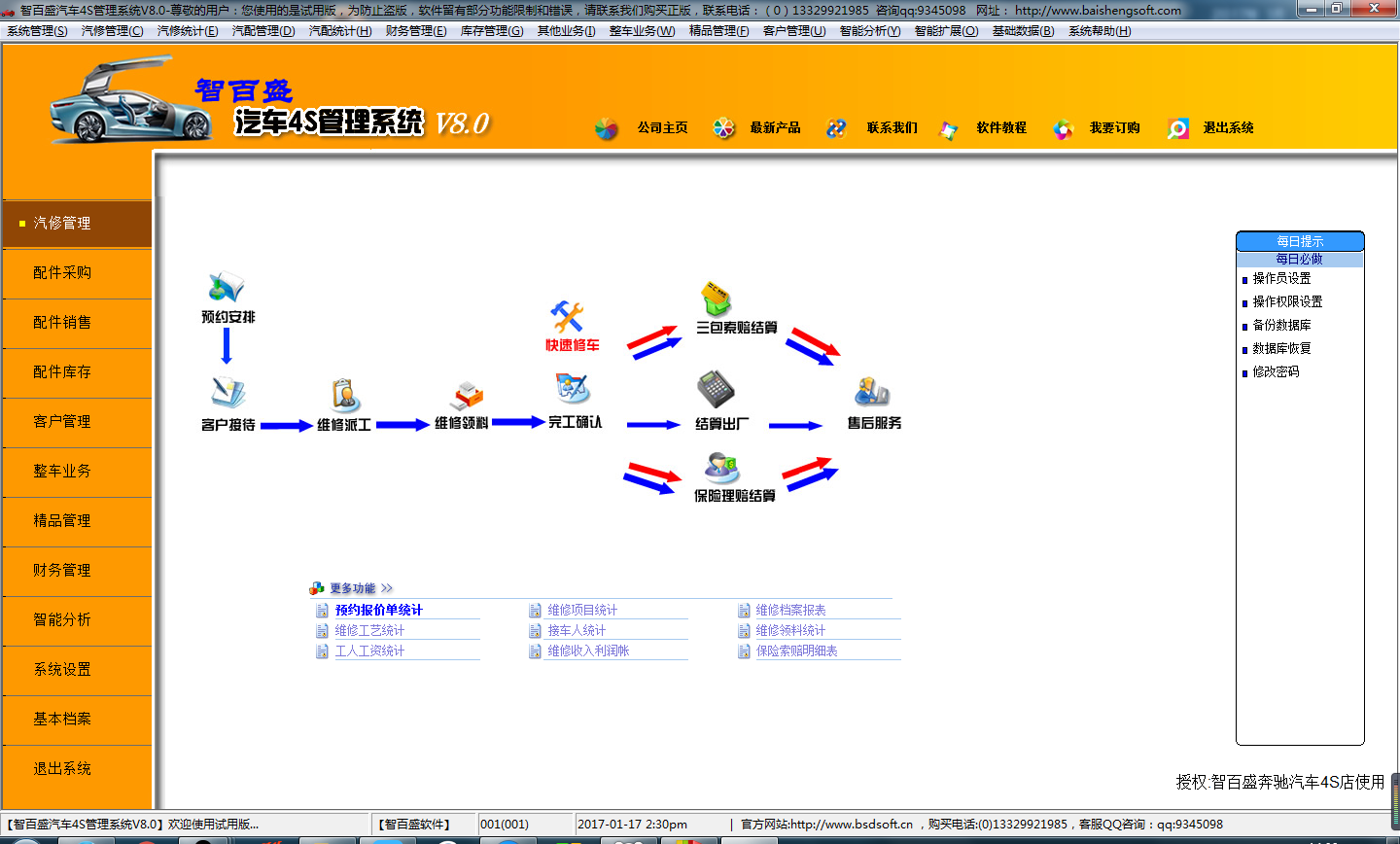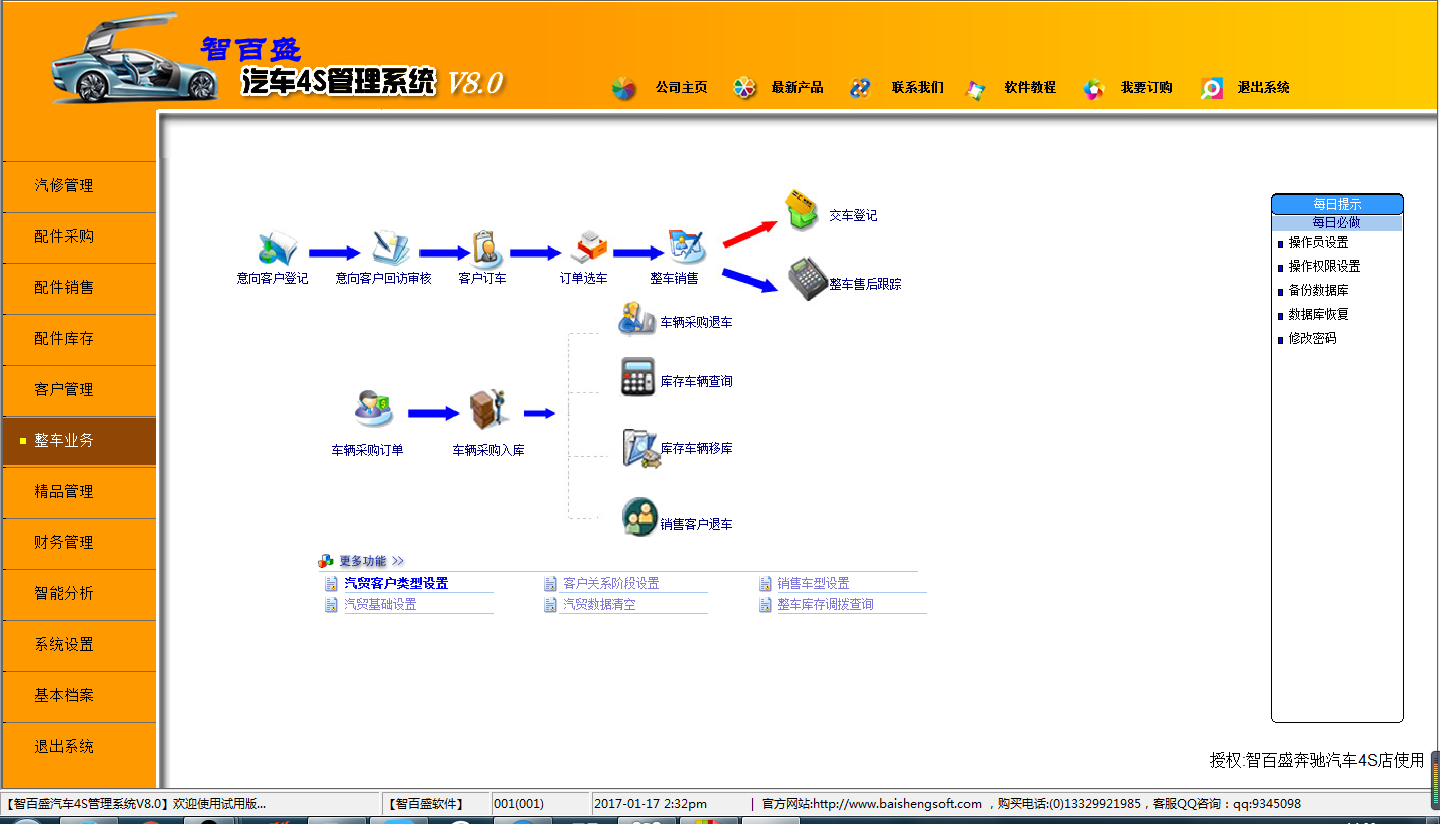 2.智百盛汽车4S管理软件功能开发完全围绕汽车4s店管理流程,包括客户微信预约、客户接待、客户订车、整车销售、精品加装、财务收款收据、汽修管理、到售后客户回访等功能,整套软件功能全面、流程清晰、所有业务单据全部可以通过电脑直接打印输出。