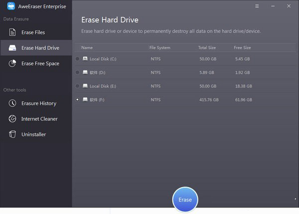 模式2将擦除整个硬盘驱动器或外部设备以破坏和擦除硬盘驱动器/设备上的所有数据。您只需选择目标硬盘或设备,然后单击“擦除”按钮。AweEraser将安全地永久删除硬盘驱动器或外部设备上的所有数据。