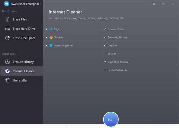 安全隐私清除工具可帮助您删除所有互联网活动痕迹(清理的记录,Cookie,密码,缓存,日志,垃圾文件等)。