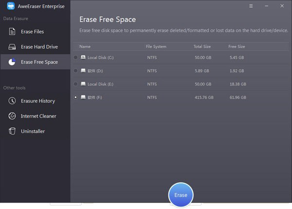 AweEraser,是一款数据清除软件,专门用于帮助大家清理电脑中一些不易删除的软件及数据,其共有三种模式彻底清除数据、清理所有设备、认证数据擦除及安全数据擦除。