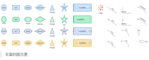 丰富的元素:内置丰富的节点与边元素,自由配置,支持自定义;