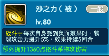 当亲密度达到三十级的时候-沙之力:战斗中每次自身受到负面效果时,物理攻击力提升5%,效果持续5回合。属于被动技能。