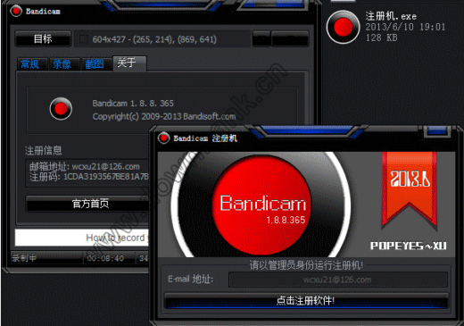 4、输入你的邮箱到注册机.exe,点击Register Applicatn按钮注册!然后运行Bandicam 程序即可。