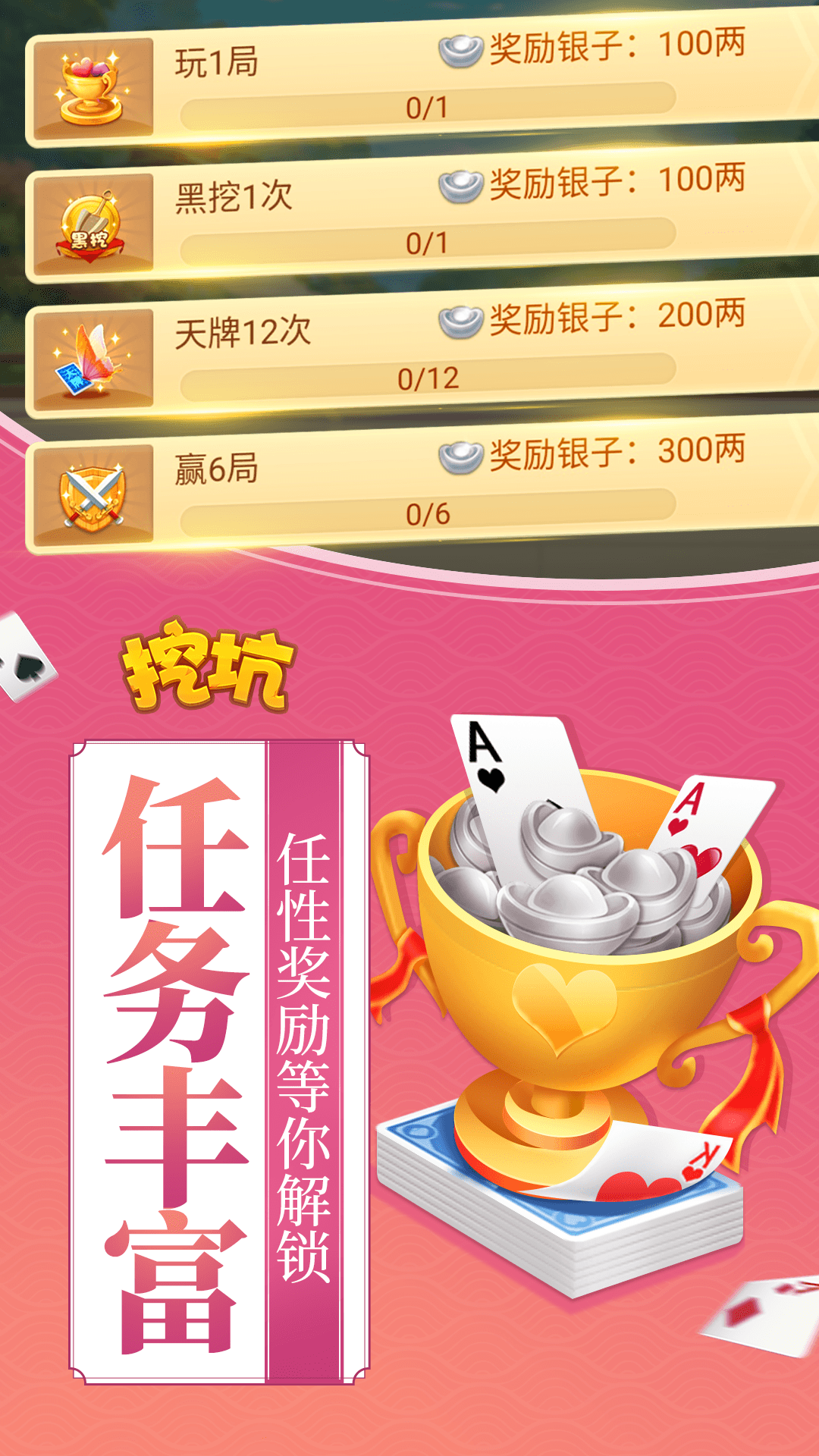 同城游挖坑是一款棋牌类游戏,同城游挖坑手游是专为陕西人民量身定制的三人挖坑游戏,是一款比更有性的本地经典棋牌游戏,其中超多奖励和经典玩法更新被广大玩家津津乐道。