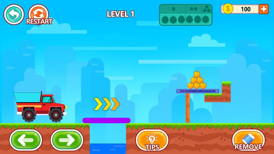 2、你需要在屏幕上画线,帮助小货车跨越各种地形,想办法让可口的和蔬菜一个不落地装进车里。