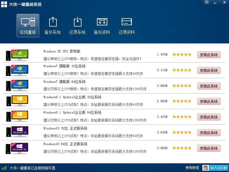 大侠一键是一款实用的系统重装工具,许多朋友都有过电脑很卡想重装下系统,可是又不知道怎么去操作,现在不用烦恼了,下载大侠一键重装系统软件,一键轻松解决重装系统问题。