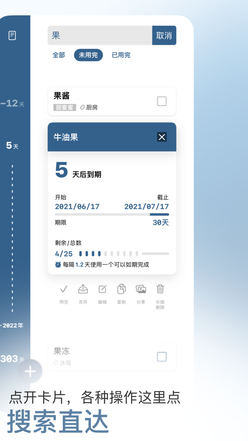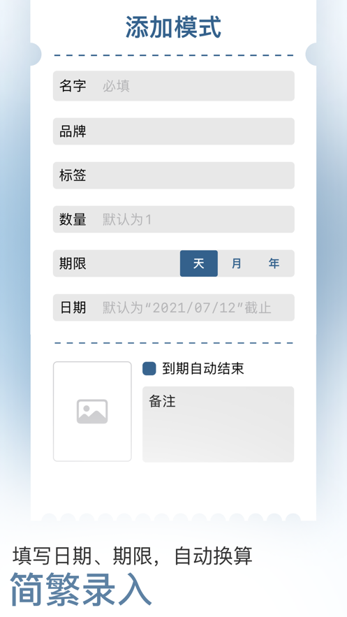 在新增物品时,最少只需输入物品名称,即可实现默认的当前到期进行录入。日期采用了“截止日期”和“生产日期”二选一模式,若选择了“生产日期”,则填入“有效期”后会自动计算出“截止日期”。当然,也提供了更多详细的录入内容,可根据物品类型选择填入。