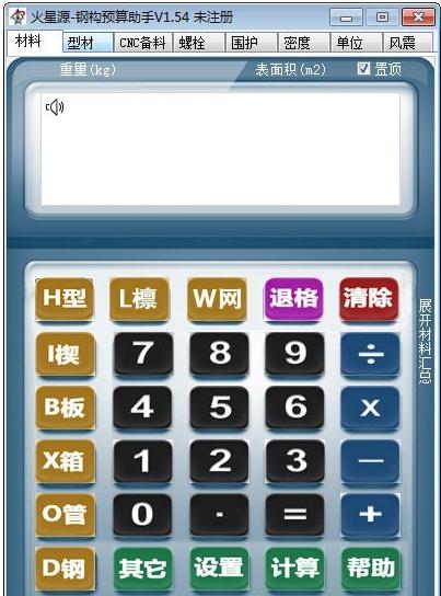 火星源钢构预算助手是款小巧好用的钢结构预算小工具,帮助用户轻松快速的计算出钢结构的预算,包含各种类型的材料计算,还可计算CNC备料、螺栓、围护、密度、单位换算、风震等。