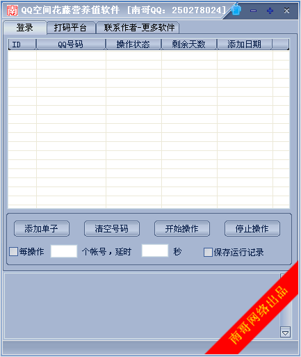 南哥QQ空间花藤营养值辅助是一款专为QQ空间花藤营养值进行提升的小工具,通过本软件可以对多个QQ管理营养值,可以查看操作状态,剩余天数,软件操作。界面清晰,欢迎下载使用。