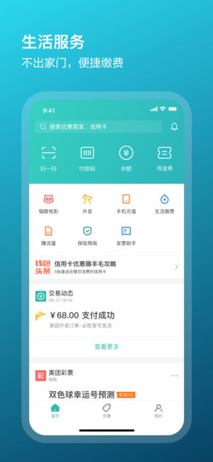 美团钱包,信用卡优惠线下线上一网打尽;优惠立享,参与活动一键支付;线下支付,吃喝玩乐,一扫即付;,不出家门,便捷缴费;商城,财产安全更有保障。