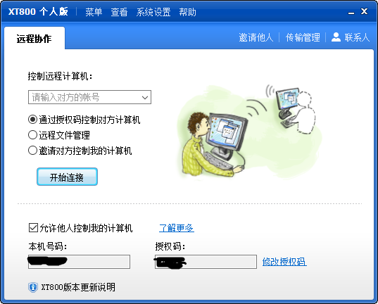 XT800个人版是一款体积小巧的软件,适合移动办公用户,远程控制公司或家里的电脑,或远程协助家人和朋友解决电脑问题,使用起来非常方便,通过授权码即可连接,有需要的用户不要错过了,欢迎下载使用!