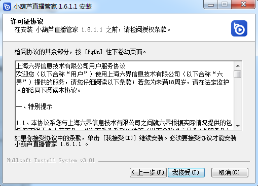 2、点击下一步出现小葫芦直播管家的许可协议,我们点击我接受