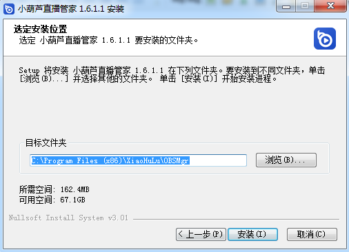 3、如下图,设定一下软件的安装位置,默认位置为“C:\Program Files\XiaoHuLu\OBSMgr”