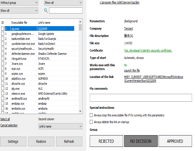 除了可以禁用和重新启用自动启动条目外,“安全启动”还使您可以添加个人注释,一键启动该文件,而无需离开程序界面,如果运行该可执行文件,则始终将其停止当前设置的参数,或者始终在启动时删除链接。