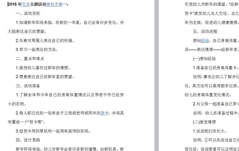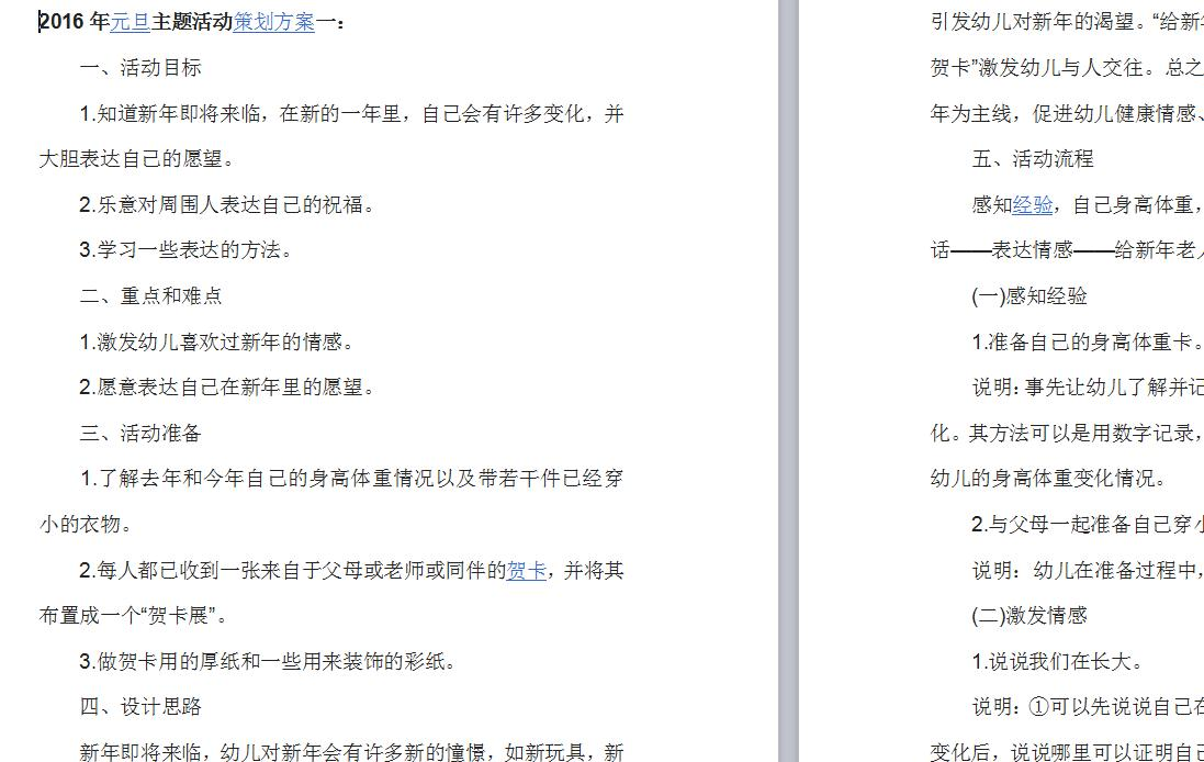 通过贺新年活动,可以激发幼儿运用语言和绘画及手工来表达自己的情感,培养幼儿的表现力。其中“我长大了”,以自己的变化引发幼儿对新年的渴望。“给新年老人写信”,表达自己的愿望。“做贺卡”激发幼儿与人交往。总之,活动以让幼儿过一个有意义的新年为主线,促进幼儿健康情感、语言表达力、美工技能等的发展。