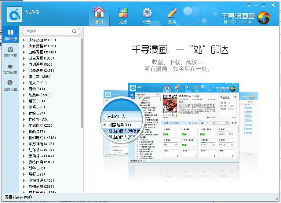 千寻漫画盒不断更新的漫画资源! 超过60000+的漫画资源可供下载,涵盖不同地区,各种类型的漫画,更新及时、迅猛,hold住所有最新最热门的漫画!从启动软件到完成一个章节的下载,仅需10秒,优化后的下载速度,带给您极致的下载体验。涵盖了现今热门漫画网站,实时同步获取最新章节更新,保证第一时间看到最新章节。成熟的技术支持,将各大热门漫画网站制成站点包收入于软件之内,各个站点资源分别打包成站点包,可以独立装载和更新。不需要再为杂乱无章的下载图片而烦恼,自动将下载后的图片有序命名,方便导入各种移动设备。