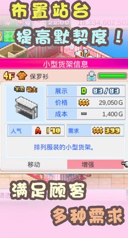 这款游戏,整体的画风以像素画风为主要的风格,并且里面的自由程度极高,作为玩家的你,需要开动脑筋来建设适合于你的风格。你可以搞各种各样的促销活动,使你的商品在短时间内销售完,此外的话招聘一个好的员工也是很关键的,所以啊考察了你的眼力。