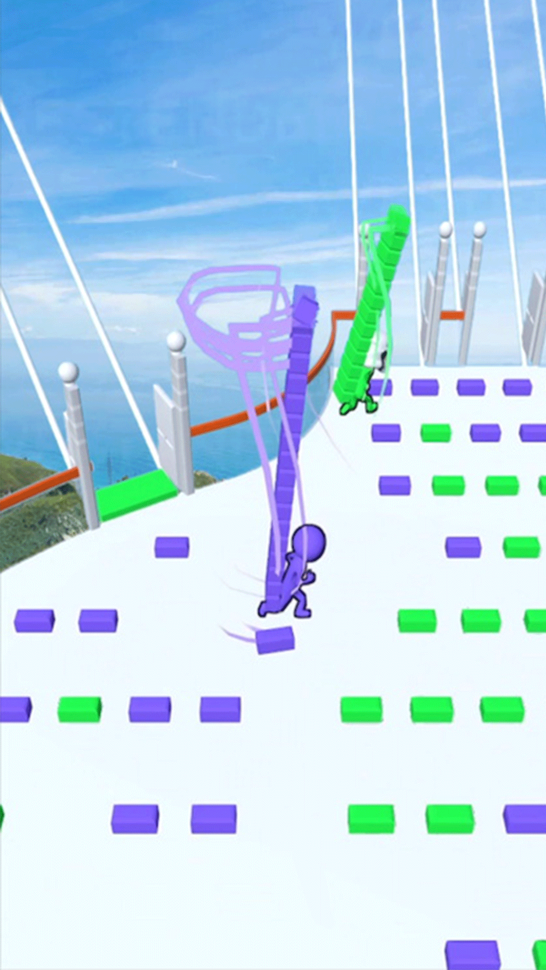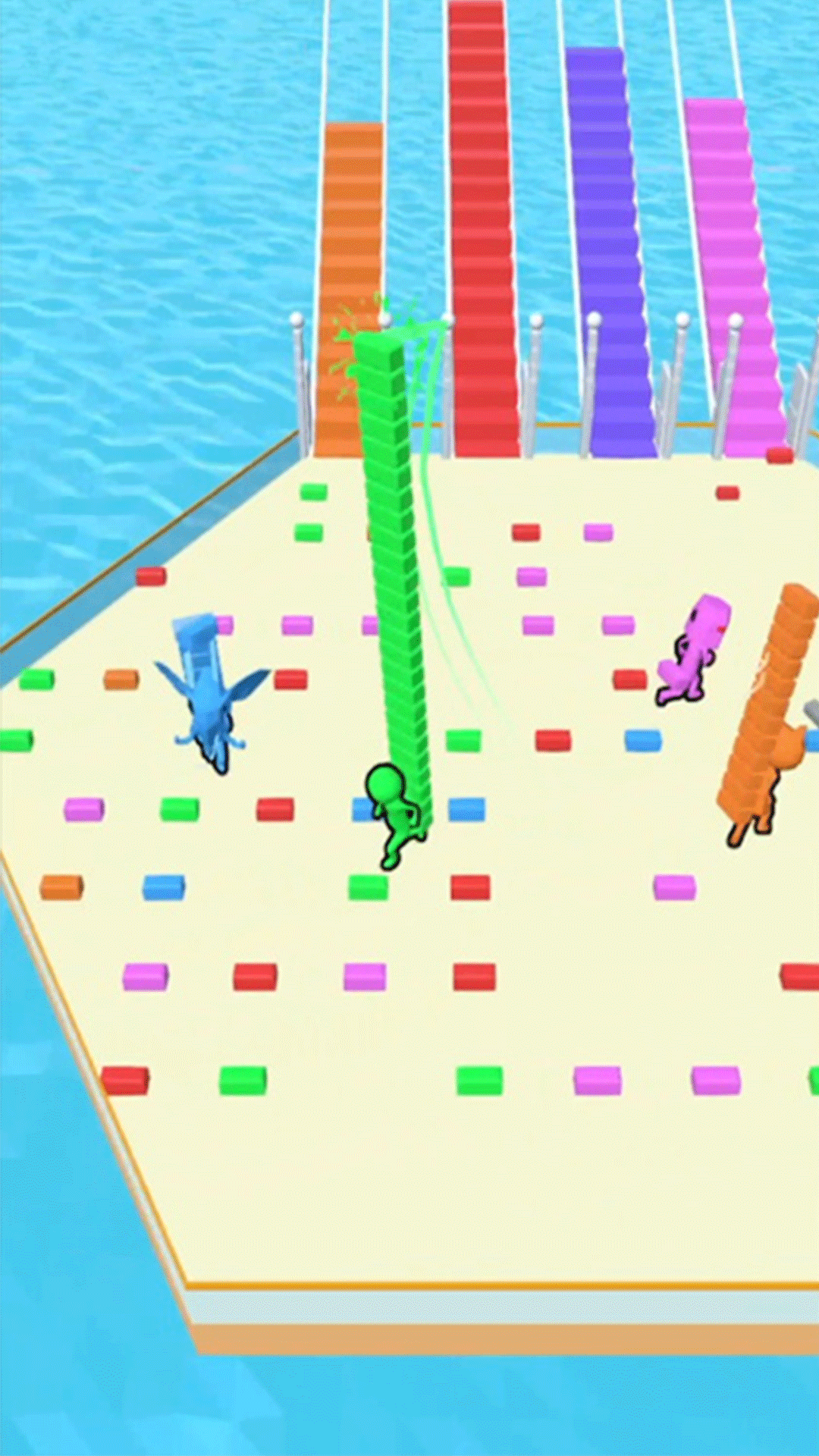考验玩家手速的游戏,游戏画风颇为的简单,玩家控制一个小人,需要收集与小人颜色相同的砖块,利用砖块进行铺路,才能到达终点,同时还能够骚扰别人获取砖块,让自己成为最快的搬砖人。