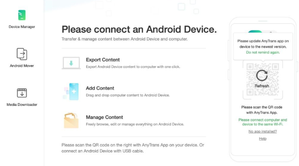 AnyTrans for Android是一款功能强大的手机文件传输软件,能够帮助用户将手机上的通讯录、、聊天、语音、视频、图片等文件上传到电脑当中,并且还能克隆同样的安卓设备进行备份还原,有需要的用户不要错过了,赶快来下载吧!