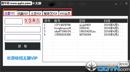 无聊VIP获取器:2016最新VIP获取神器,能让您通过的操作,获取到最新的会员VIP、优酷会员VIP、土豆VIP、爱奇艺VIP和PPS会员账号及密码,想看VIP视频资源,又想免费的,一定得试试