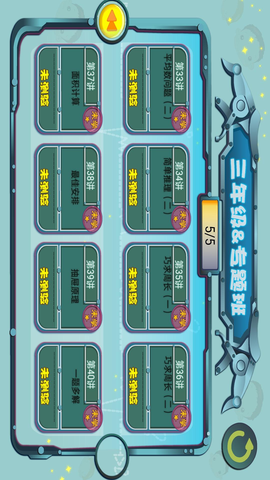 “奥数讲堂”每一讲包含“课程引导”、“例题讲解”、“练习”、“强化训练”四个学习流程,每一讲有对应的学习状态标志,初始状态为“未学”;