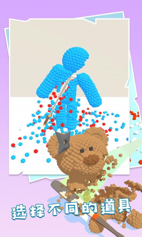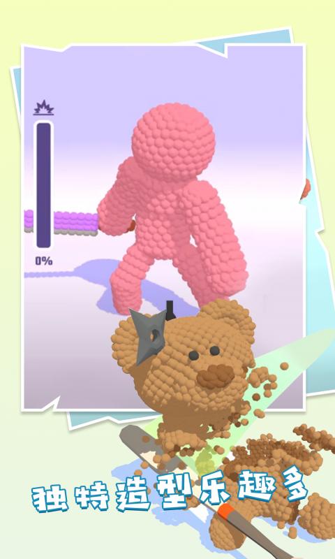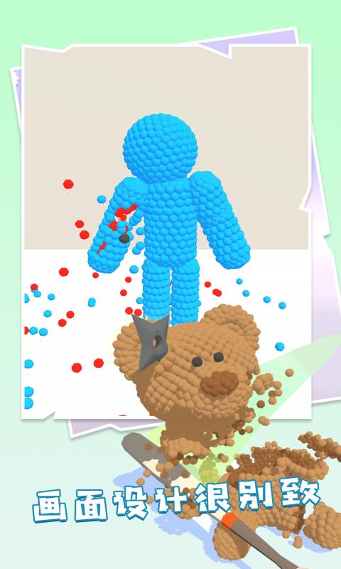 休闲解压类游戏,这款游戏的画风设计特别的精美和,在游戏中,你将会见到一个巨大的橡皮人,你可以用刀来进行切割,也可以使用武器来射击,用最快的速度完成任务,在游玩的时候千万不能让它成功接近你,否则就算游戏结束