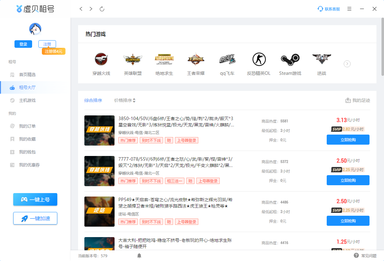 虚贝游戏是国内专业便捷游戏租号借号平台,平台有5万个极品游戏账号供您选择,绝地求生租号、CF租号、LOL租号、王者荣耀租号、逆战租号、租号等端游手游都可以在虚贝游戏上号器上租号使用。