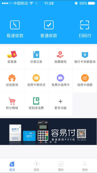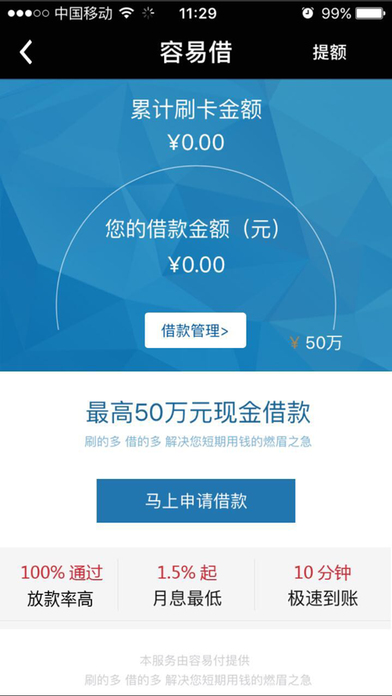 能借款的MPOS,最高50万元现金额度!容易付到拥有安全支付认证,商家便捷收款,余额查询,低风险更安全,银行级风控标准,账户资金安全强力保障。