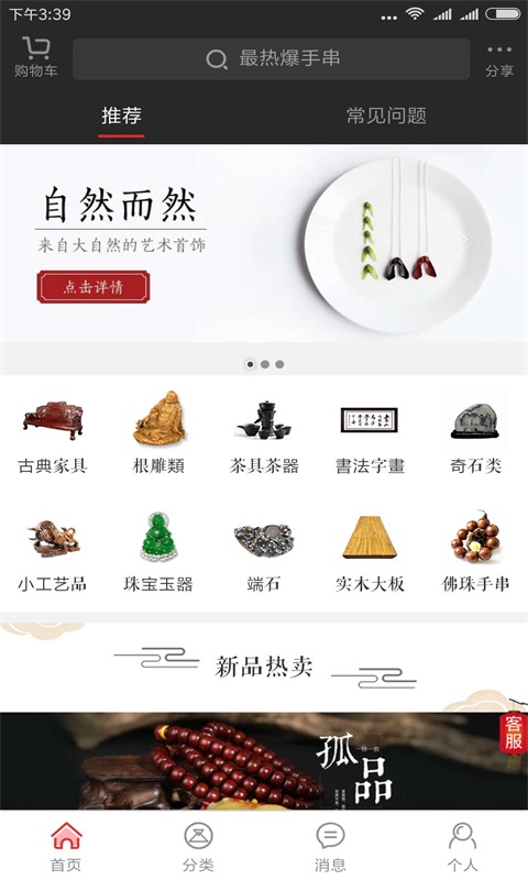 佛珠手串、竹木根雕、天然奇石、古典家具、珠宝玉器、茶叶茶器、书法字画、文玩杂项等几十种品类,上万件特有的美学孤品;