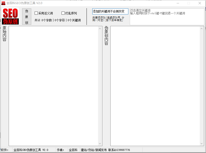 全百科SEO是一款非常好用的免费伪原创工具,能够帮助用户进行中文和英文伪原创,轻松实现对文章内容的伪原创,还能自由修改本地数据,使用起来非常方便,有需要的用户不要错过了,赶快来下载吧!