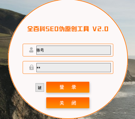 1、运行“全百科SEO伪原创工具.exe”程序,点击“登录”左边的“破”,即可生成账号及密码,再点击“登录”,提示“登陆成功”,即可开始使用。
