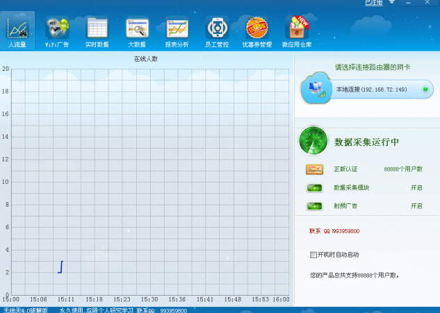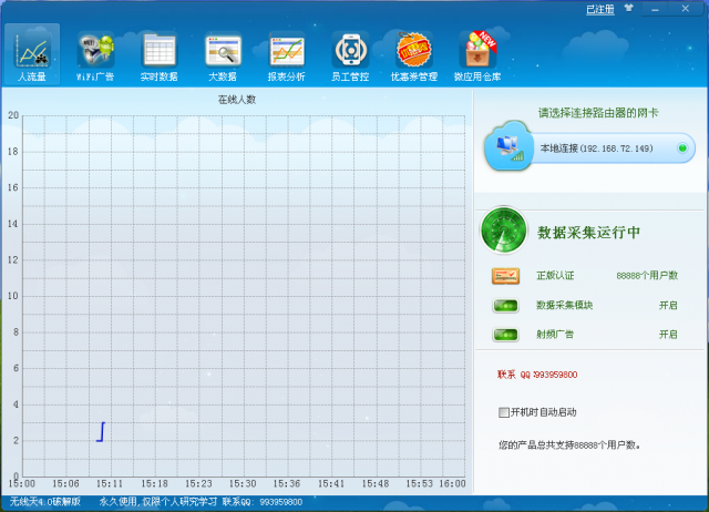 无线天软件是一款可以在不改变网络结构的情况下,将普通的WiFi路由器变成WiFi智能路由器的软件。通过WiFi收集用户各种社交帐号,帮助用户建立真正的会员以及二次的生态大数据,从而帮助用户构建数据的生态系统,需要的朋友欢迎下载使用。