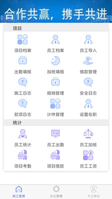 工人实名制管理、项目管理、记工考勤、加班小时、计件管理、借款、报销、施工日志、计件发放、借款发放、报销发放、工资发放等。