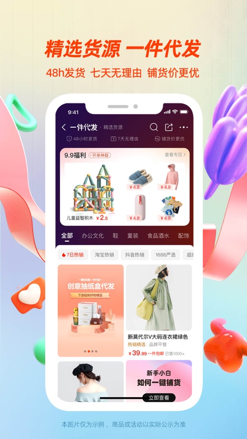 为买家提供了一件代发,微店商家代发,淘店优选,快速补货,伙拼,闪电批,今日团,实力铺货,1688直播,好货推荐,进口货源,热门市场,电商,,商友圈,