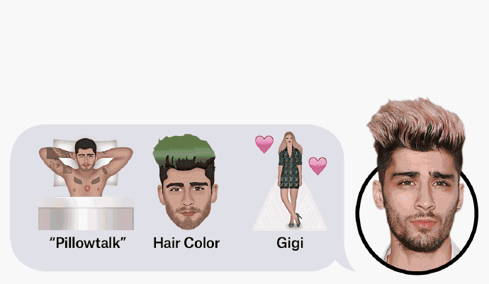 美渣新专Pillowtalk、以及他值得众人讨论的发色以及女友超模Gigi都是值得令众人讨论的元素,设计师将这些元素加入到表情包中,令表情包特色无穷。