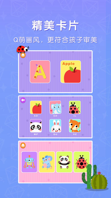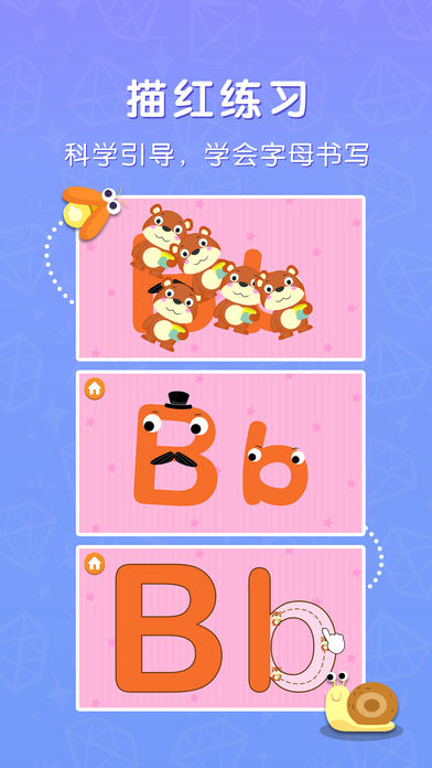 APP中将字母描红和发音练习、趣味动画有效地结合起来,让枯燥的字母书写不再乏味。