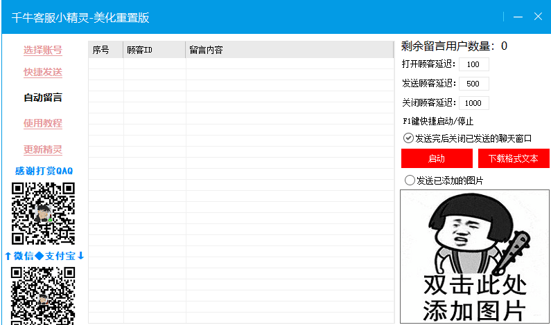 千牛客服重制版是一款能够帮助千牛客服进行快速回复的工具,能够自定义各种话术一键发送,能够为客服工作节省大量时间,有需要的用户不要错过了,欢迎下载使用!