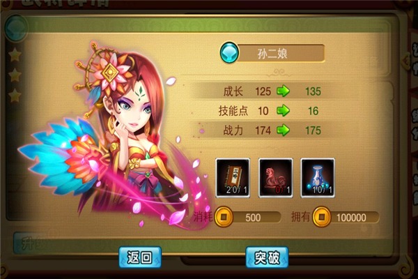 武将突破:武将最多可突破20次,每一次突破都可以提升武将的成长、技能点和战力。在游戏中,于聚义厅中点击武将,在武将详情中,可以点击突破,消耗突破材料和铜钱来提升武将的突破次数。