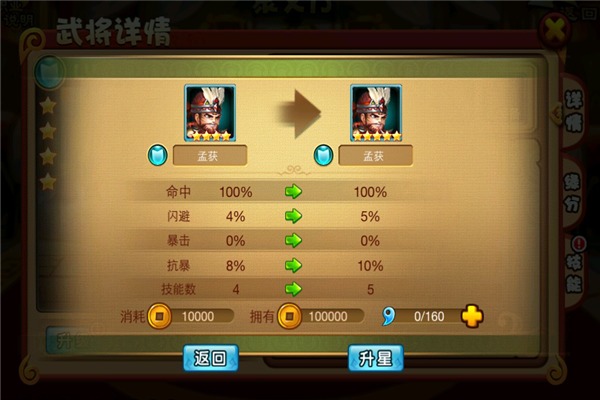 武将升星:武将最多可升至5星,每一次升星都可以提升武将的二级属性和战力。在游戏中,与聚义厅中点击武将,在武将详情中可以点击升星,消耗武将魂魄和铜钱来提升武将的星级。