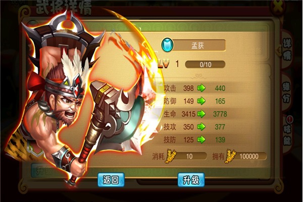 武将升级:顾名思义,就是提升武将的等级。每一次升级都可以提升武将的基础属性和战力。在游戏中,除了副本战斗可提升武将等级经验外,也可在聚义厅中点击武将,在武将详情中,点击升级消耗粮食来提升武将的等级。