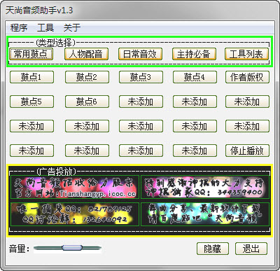 天尚音频助手是一款有着70多种常用音效,,自定义音效选择,自动存取记事本(退出软件自动存档,再次进入软件自动读取,配置文件放在软件存放目录下“配置.ini”中),等多功能的音频助手,可用于mc喊麦以及主持。