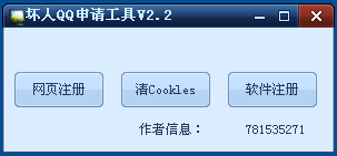 坏人QQ申请工具是一款免费快速申请QQ的辅助工具,内置网页注册功能,在点清楚COOKies,本软件绝对没毒。不管你们信不信,反正我是信了。