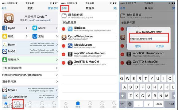 ③ 继续在Cydia应用,添加源apt.tongbu.com。安装过程中可能会报错,如果报错就点左上角的取消,没有影响的,然后点击返回Cydia。