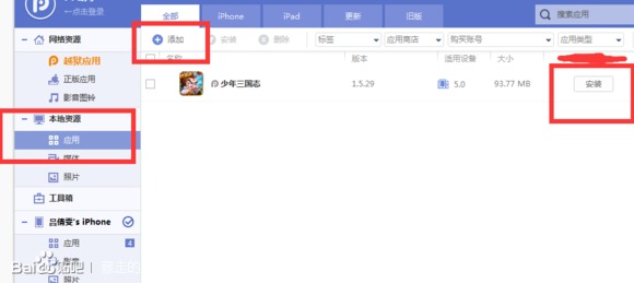 ⑥ 三个插件安装完成后,可到光环游戏中下载光环版本Ipa包安装就行,使用电脑上的PP助手可以直接安装客户端。具体步奏为先连上手机,在本地资源-应用-添加-选择网盘所下载的ipa包-安装。