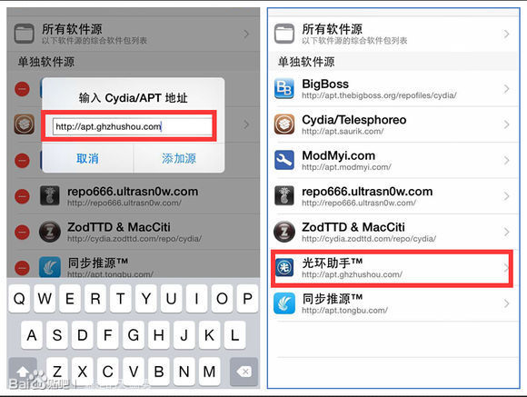 ⑤ 添加光环助手源 apt.ghzhushou.com 里面可以下载到针对高版本iOS系统的补丁 光环助手iOS版的都将使用这个源,大家可根据情况安装。
