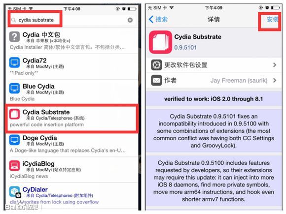 ② 越狱后,打开【Cydia】应用,然后选择搜索Cydia Substrate,然后安装这个插件。