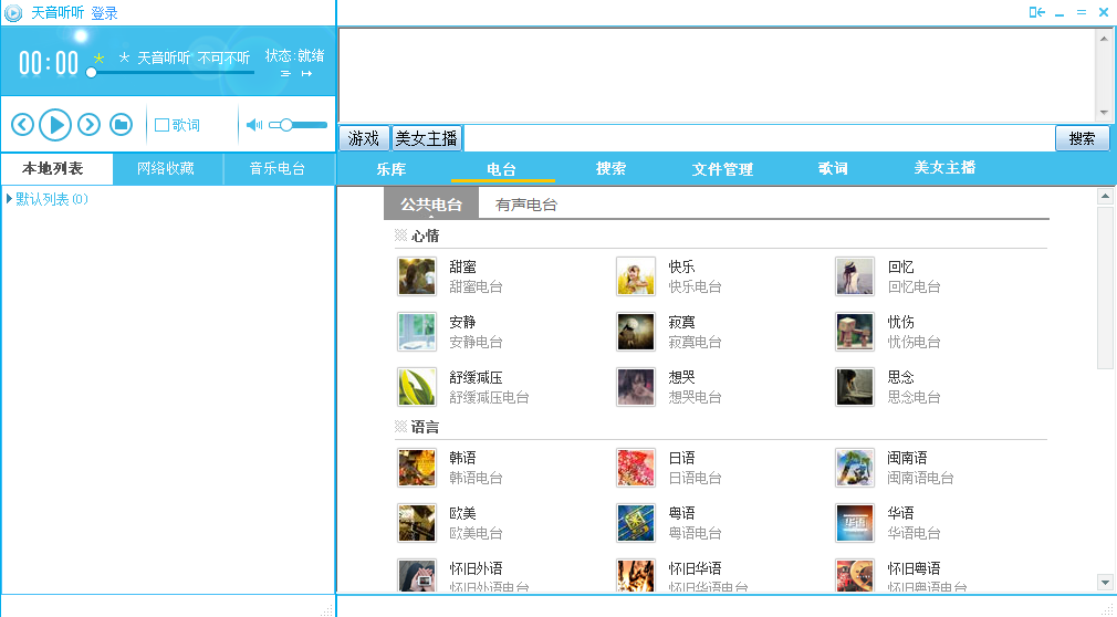 公共电台界面,心情类电台、语言类电台、年代、流派、地点。