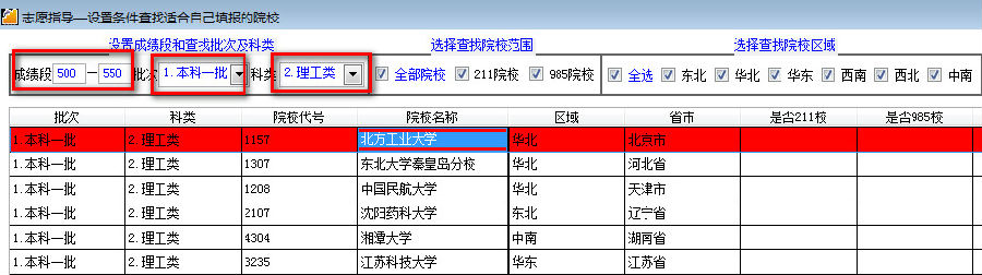 只需要输入成绩段、本科批次及科类,就可出现对应的学校。