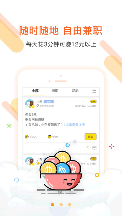 提供1到2分钟手机上就能完成的兼职任务,类似问卷采集图片分享等兼职,让学生每天花3分钟就能赚10元以上