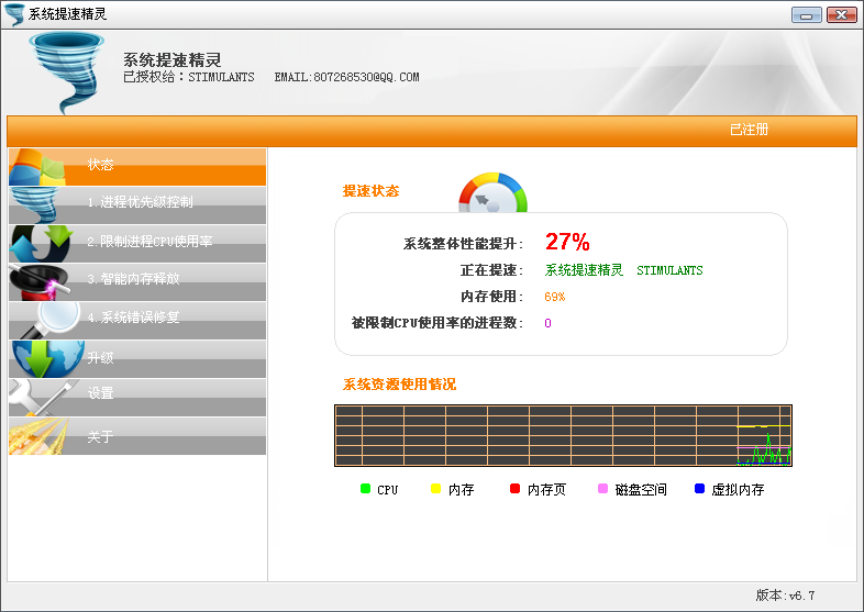系统提速精灵不需安注册码,它绿色免安装打开后就已经注册,其完美拥有进程优化级控制、限制进程CPU使用率、智能内存释放和系统错误修复四种加速电脑运行速度的方式,另外还可以屏蔽。